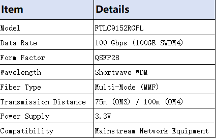 The Finisar FTLC9152RGPL is a high-performance 100G QSFP28 optical module, designed for data center and enterprise network deployments. It delivers stable 100Gbps multi-mode fiber connectivity via SWDM4 technology, with plug-and-play compatibility for mainstream network equipment, making it ideal for high-bandwidth network upgrades and short-reach data center links.