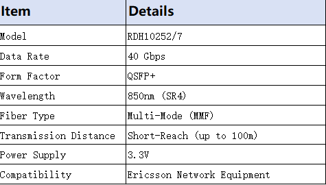 The Ericsson RDH10252/7 is a high-performance 40G QSFP+ optical module, designed for data center and enterprise network deployments. It delivers stable 40Gbps multi-mode fiber connectivity, with plug-and-play compatibility for Ericsson network equipment, making it ideal for high-bandwidth short-reach network expansion.